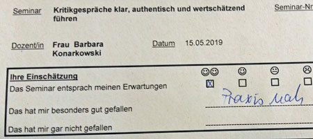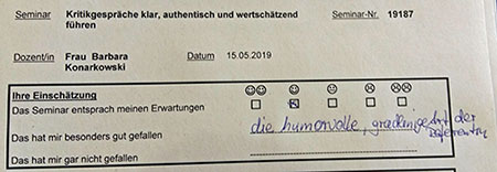 - „Die Referentin war sehr lebendig und strukturiert. Sie hat die Gruppe gut geführt und kommt geschickt auf den Punkt zurück. Super Zeitmanagement im Seminar.