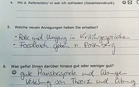 - „Sehr hilfreich waren für mich die Gesprächs-Strategien, die genaue Anleitung zur Vorbereitung von schwierigen Gesprächen und die Übungen in kleinen Gruppen. Jetzt weiß ich, wie ich schwierige Themen ansprechen und wie ich Kritikgespräche führen kann.“
